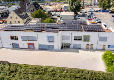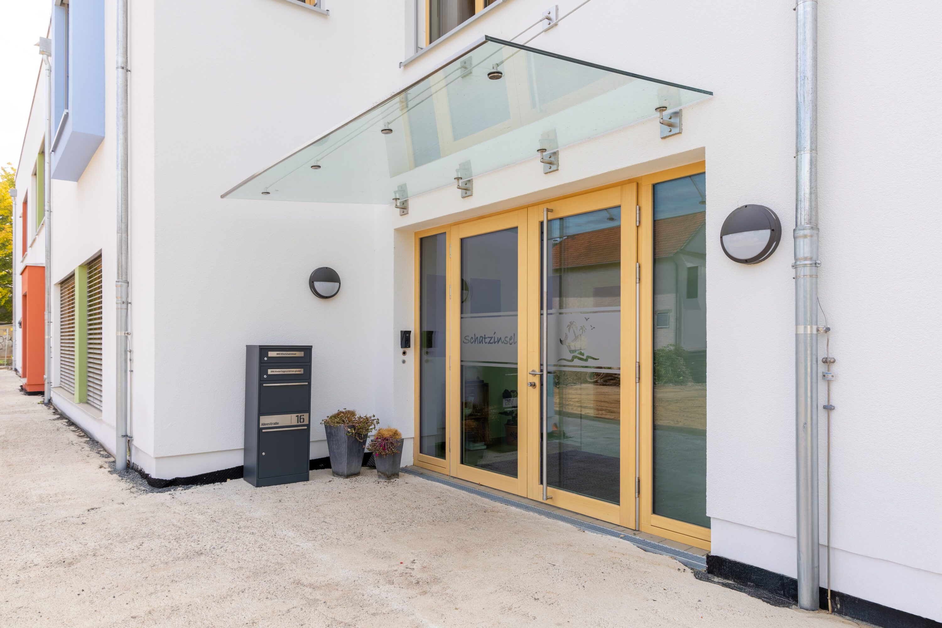 Die Kita besteht aus einem zweigeschossigen Baukörper in Holzrahmenbauweise mit Putzfassade und begrüntem Flachdach. Ein markantes Fassadenelement bilden drei farbige Kuben an der Eingangsseite, die aus der Gebäudehülle hervortreten und im Innenraum tiefe Fensterbänke als Sitzbereiche schaffen. Die Umsetzung erfolgte als „klimafreundliches Nichtwohngebäude“ im kfw40-Standard mit QNG+. Großflächige Photovoltaikmodule auf dem Dach unterstützen eine nachhaltige Energieversorgung. Der Baukörper wurde klar gegliedert und ohne Unterkellerung realisiert.