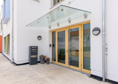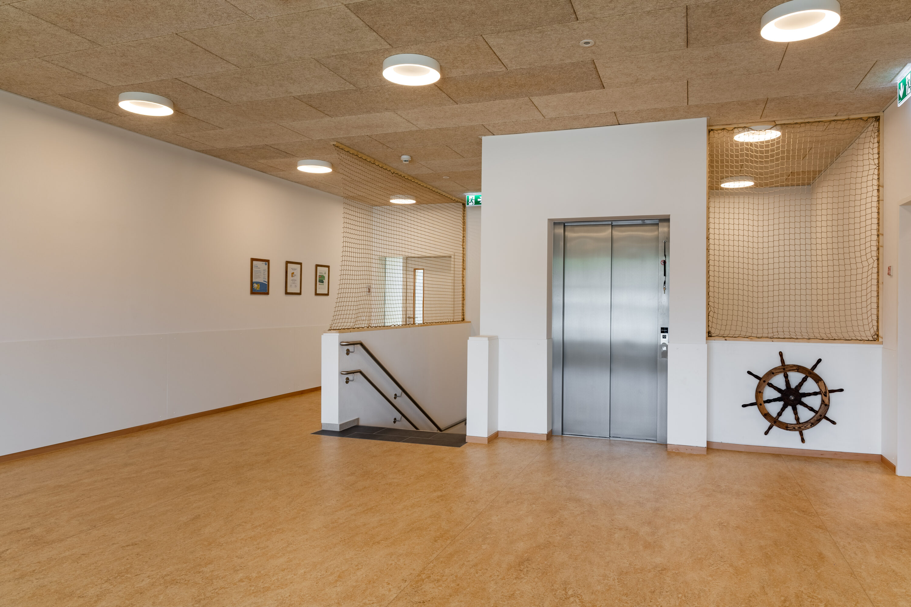 Aus statischen und brandschutztechnischen Gründen wurde der Aufzugskern mit Betonmassivwänden ausgeführt. Um die Anforderung an die Barrierefreiheit zu gewährleisten, wurde das Obergeschoss neben dem Treppenhaus über einen Aufzug erschlossen.